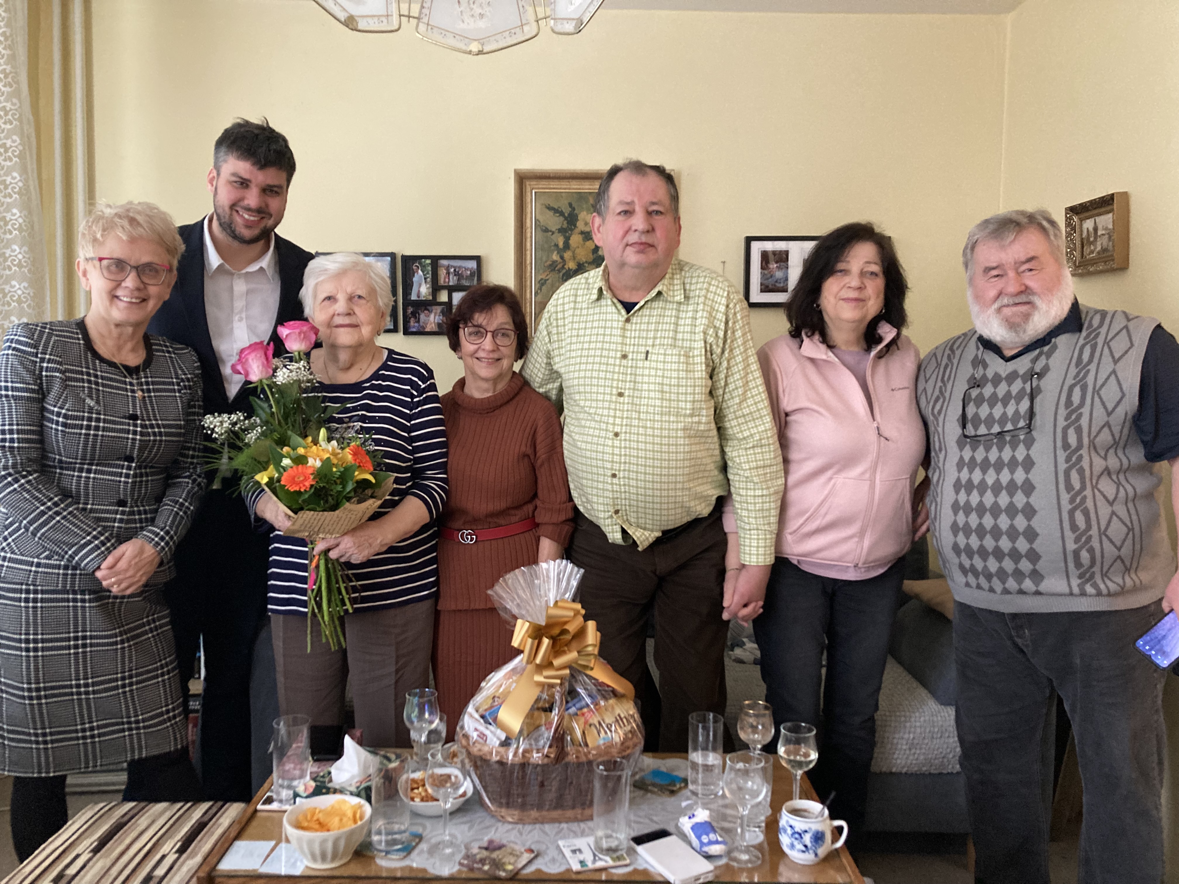 Kromě tradiční gratulace a předání květiny s dárkovým košem proběhla také se samotnou oslavenkyní i jejími rodinnými příslušníky úžasná diskuze na různá témata. A zjistili jsme, že se vlastně všichni tak trochu známe, nebo máme společné známé. Holt svět je malý a Střekov obzvlášť :)